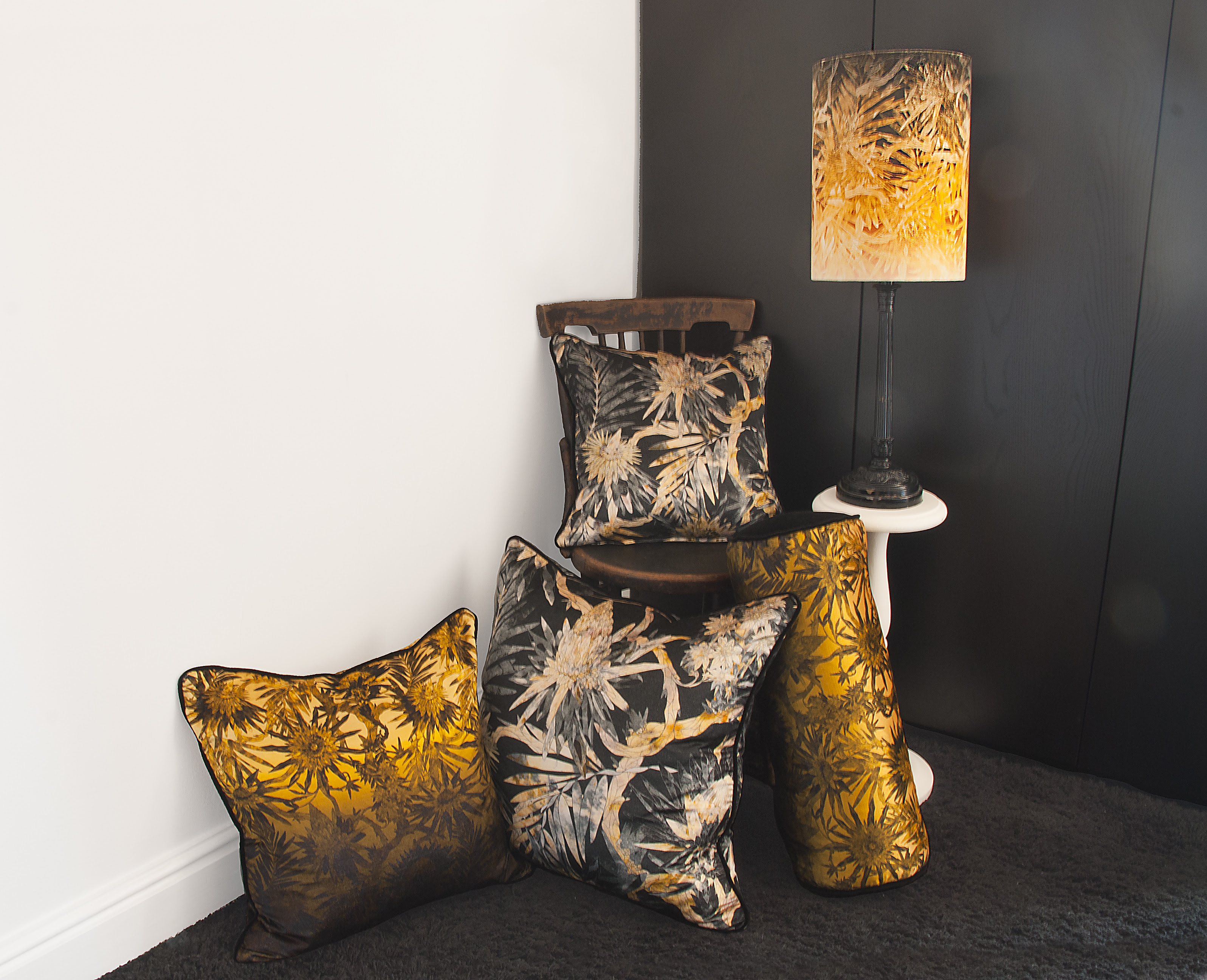 Pyrite is a nod towards Swarm Design Englands more usual pallet, being mainly tones of grey. Charcoal and slate but with a flash of lustrous gold, for a simpler but no less impressive feel.’