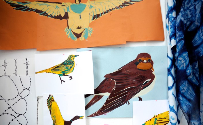 Hannah Ellicott works at her desk making 3D pieces for interiors and Polly Rowan stands beside her wallpaper lengths.