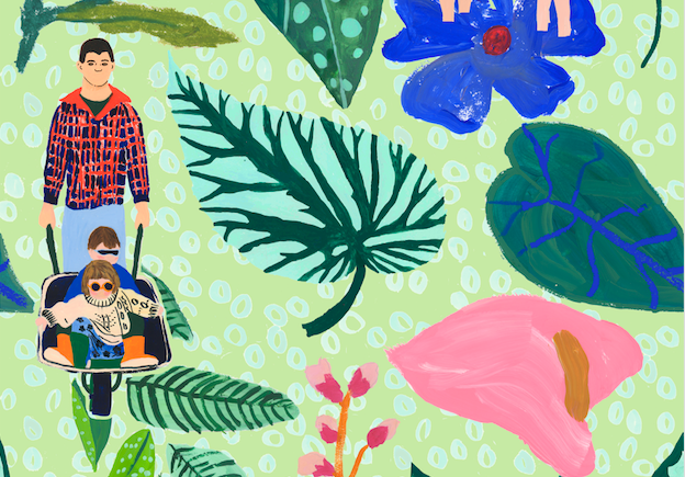 I have chosen to take the garden landscape , illustrations of my family and pets and to integrate them with tropical plants drawn from a recent visit to the Eden project.